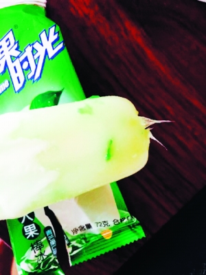 許先生說:“那天下午兩點(diǎn)多,我去超市買了6個(gè)宏寶萊的鮮果時(shí)光雪糕,回家后我和父母每人吃了一個(gè),而我的那個(gè)雪糕沒吃幾口就咬到一個(gè)硬物。我以為是椰果,便用力咬了一下,卻發(fā)現(xiàn)根本咬不動(dòng),低頭一看,發(fā)現(xiàn)雪糕里露出一塊塑料布。因?yàn)槲矣昧σ?,這塊塑料布已被拽出一部分,還有一部分凍在里面?!庇浾呖吹皆S先生拿出的雪糕上半部分露出了兩塊塑料布。