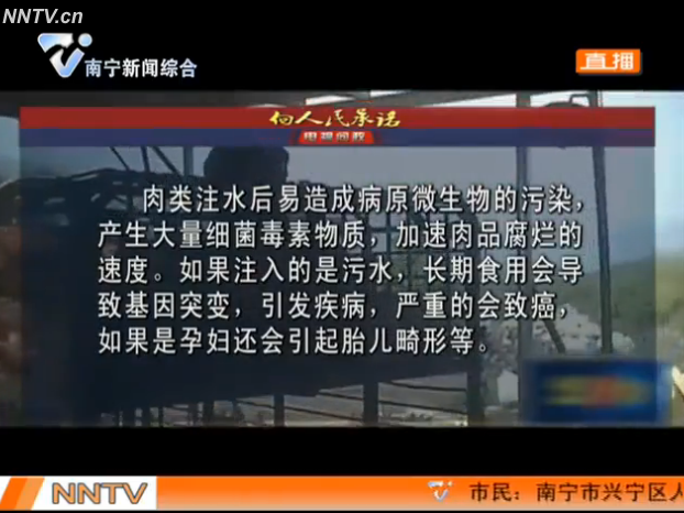 南寧市食品藥品監(jiān)督管理局局長黃明瑞回應:對于注水肉的問題,我們從改革以來就一直堅持打擊,特別是今年夏季針對肉類食品進行了大規(guī)模的整治行動,發(fā)現(xiàn)問題后馬上進行懲處。首先我們要從源頭上杜絕注水肉,第二,肉類在進入市場要進行檢驗檢測,合格以后才能上市銷售,市場開放方要建立查驗查證制度,作為監(jiān)管部門要加大巡查力度,發(fā)現(xiàn)有違法添加的要立案進行查處。