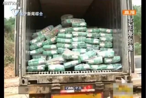5月7日上午11點30分,劉圩鎮(zhèn)覃坡一處廢棄的木片廠區(qū)內,兩輛玉林牌照的紅色集裝箱貨車停放在空地,幾個貨車司機邊觀望邊等待。兩小時后,一輛藍色大貨車開進廢棄廠區(qū),并與其中一輛集裝箱貨車尾對尾交接。
