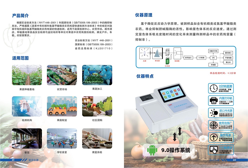 深芬儀器生產(chǎn)的安卓智能型農(nóng)藥殘留測(cè)定儀;是根據(jù)農(nóng)業(yè)標(biāo)準(zhǔn)方法(NY/T 448-2001)和國家標(biāo)準(zhǔn)(GB/T5009.199-2003)中的酶抑制率法,嚴(yán)格遵循《GB/T5009.199-2003蔬菜中有機(jī)磷和氨基甲酸酯類農(nóng)藥殘留快速檢測(cè)方法標(biāo)準(zhǔn)》中的規(guī)定對(duì)蔬菜中有機(jī)磷和氨基甲酸酯類農(nóng)藥殘留的快速檢測(cè)??蓮V泛應(yīng)用于各級(jí)蔬菜檢測(cè)中心、農(nóng)貿(mào)市場(chǎng)、超市、環(huán)保機(jī)構(gòu)、蔬菜種植基地、飯店、車載及實(shí)驗(yàn)室等食品安全檢測(cè)與監(jiān)控場(chǎng)所等單位對(duì)果蔬中農(nóng)藥殘留的檢測(cè)。農(nóng)藥殘留測(cè)定儀能準(zhǔn)確、快速檢測(cè)出蔬菜、水果、糧食、茶葉以及土壤中有機(jī)磷和氨基甲酸脂類農(nóng)藥殘留的快速檢測(cè)。