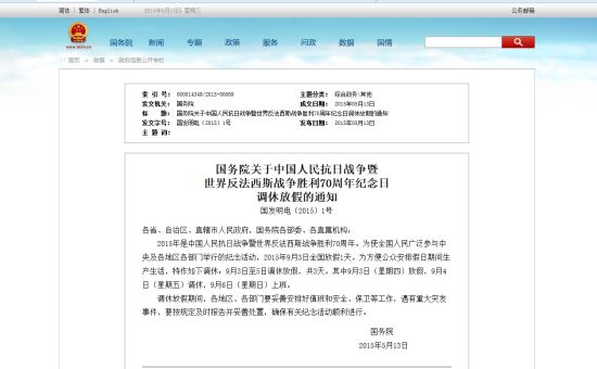9月3日放假1天原標題:國務院關(guān)于中國人民抗日戰(zhàn)爭暨世界反法西斯戰(zhàn)爭勝利70周年紀念日調(diào)休放假的通知